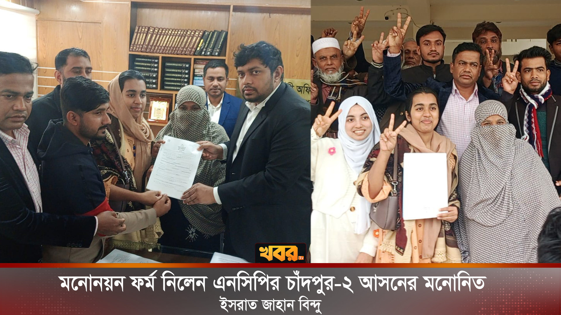জাতীয় নাগরিক পার্টির মনোনীত প্রার্থী ইসরাত জাহান বিন্দু শহীদ আব্দুর রহমানের পরিবারকে সঙ্গে নিয়ে চাঁদপুর-২ (মতলব) সংসদীয় আসন থেকে মনোনয়নপত্র ক্রয় করেছেন।